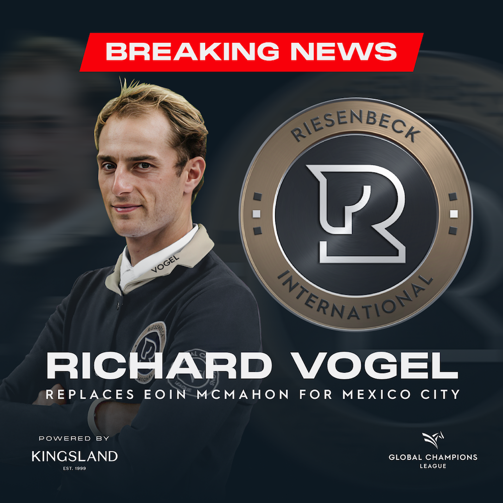 In an unexpected turn of events, Riesenbeck International powered by Kingsland Equestrian have announced a change in their lineup due to an injury sustained by Eoin McMahon. Current world number 14 Richard Vogel has been recruited to replace Eoin McMahon on the current reigning GCL champions’ team roster and will take part in Mexico City this weekend 11 - 14 April 2024.