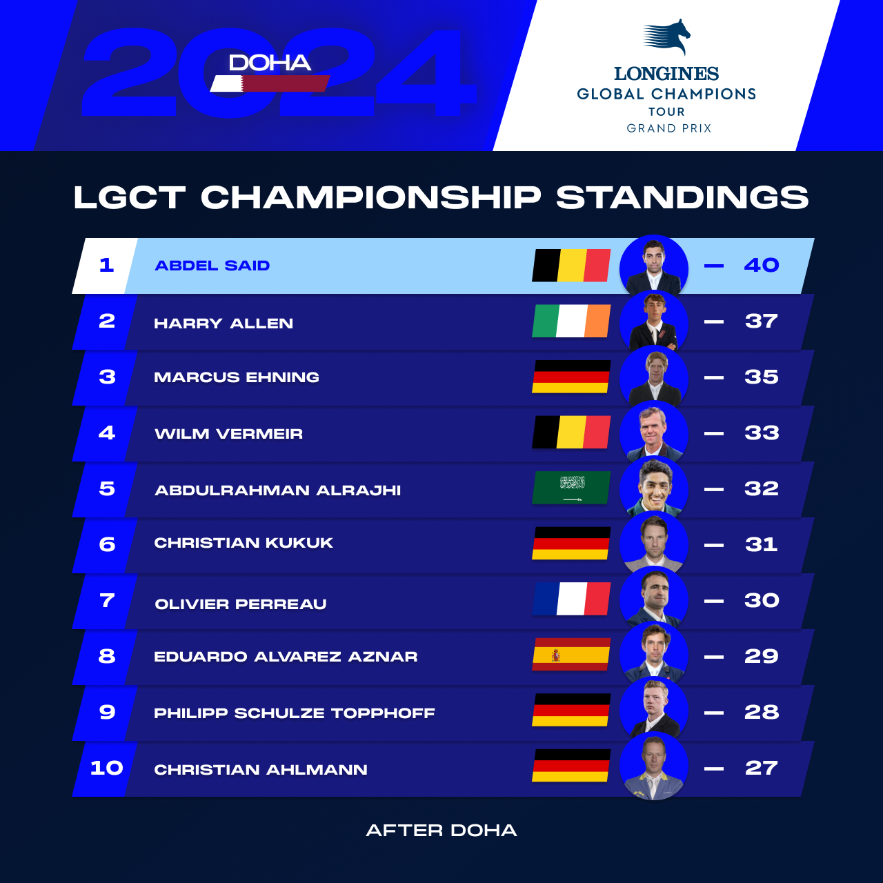 The 2024 Longines Global Champions Tour championship race has kicked off in grand style, setting the stage for an exhilarating journey ahead. The top ten contenders have been unveiled following the ultimate season opener in Doha, Qatar, a thrilling spectacle that set the tone for the battles to come.
