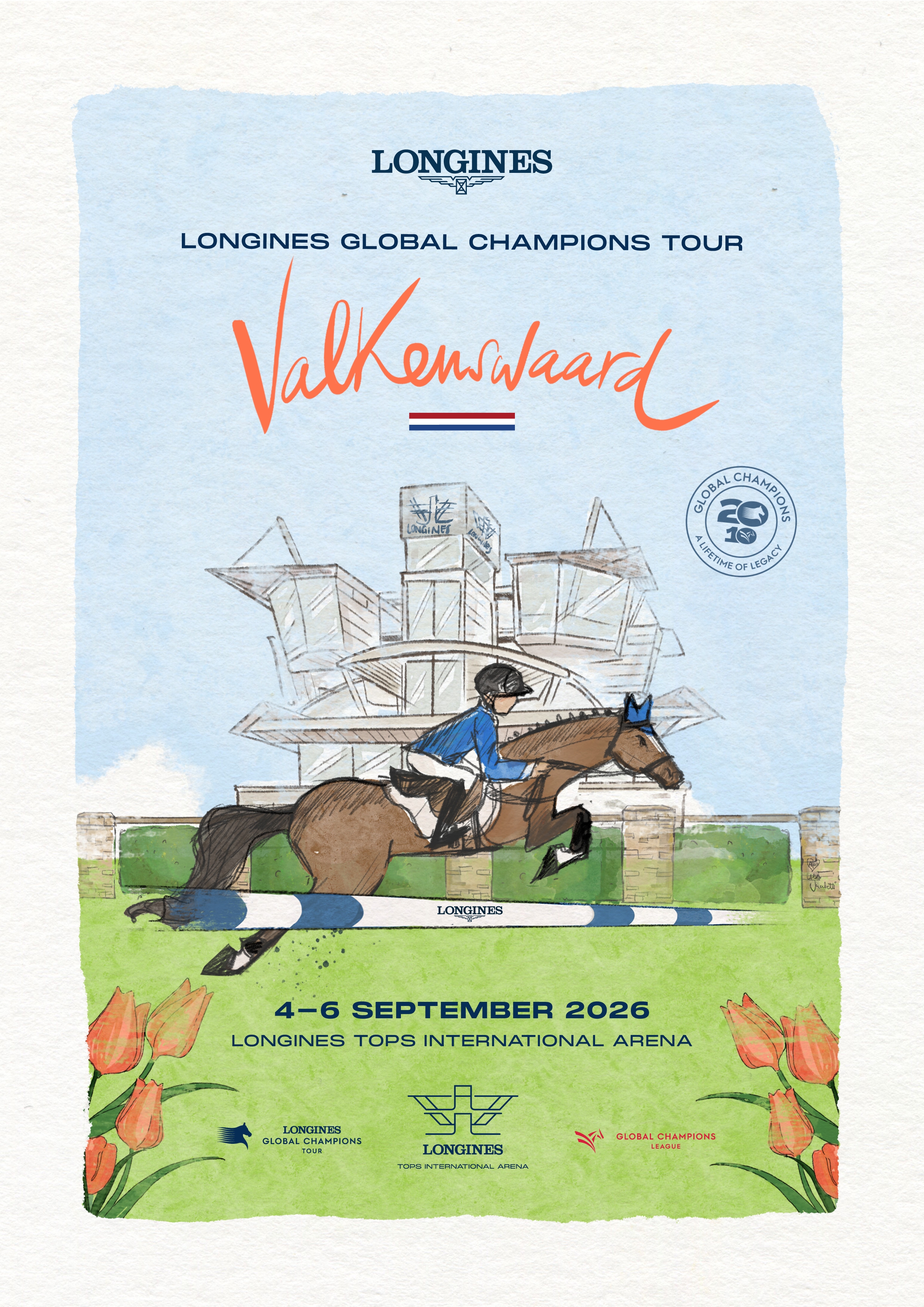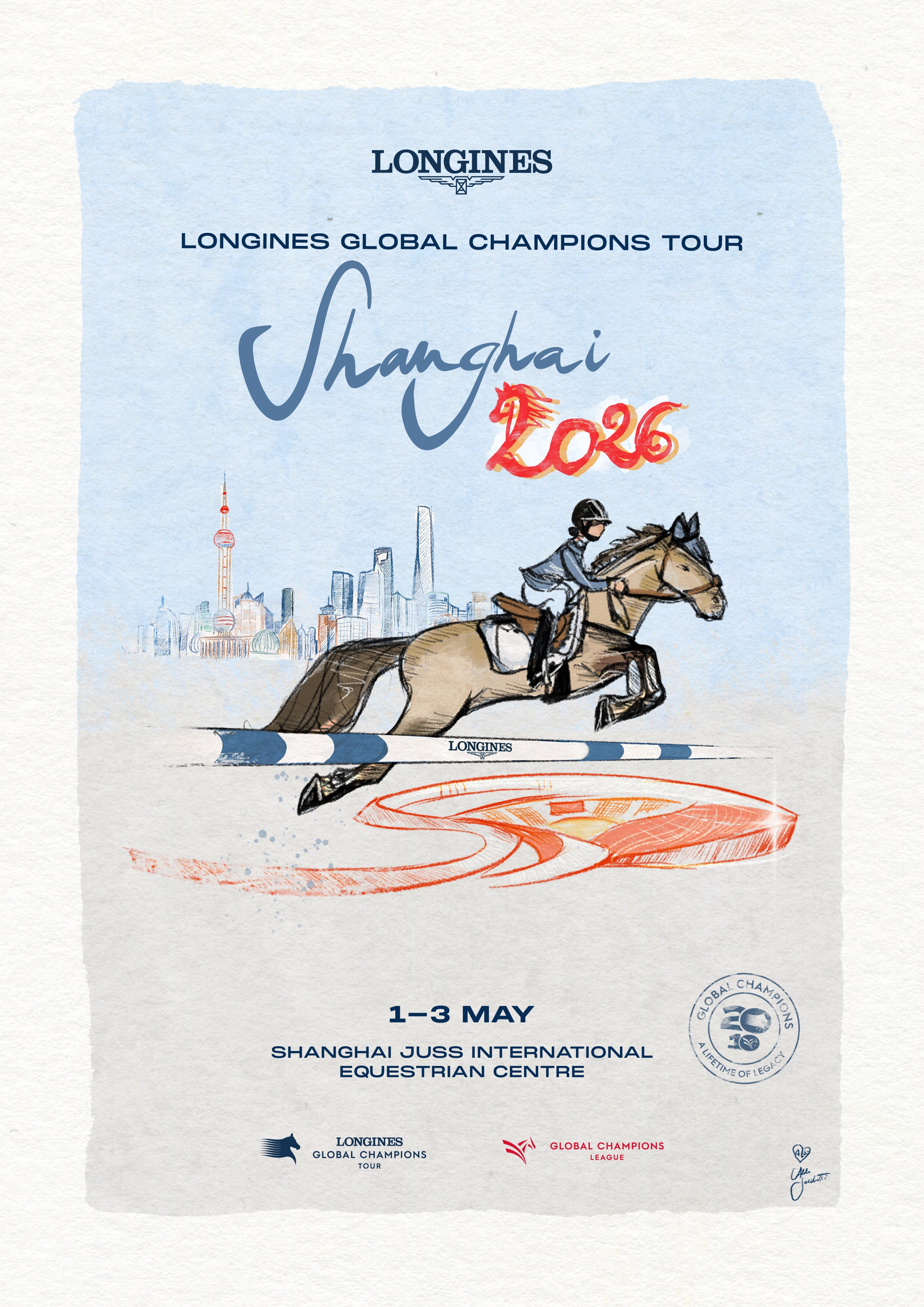A landmark season comes to life through art. Created with artist Aldo Sacchetti, the 2026 Longines Global Champions Tour poster series captures the spirit, elegance and energy of each destination – uniting 20 years of LGCT and 10 years of GCL in one cohesive visual language.