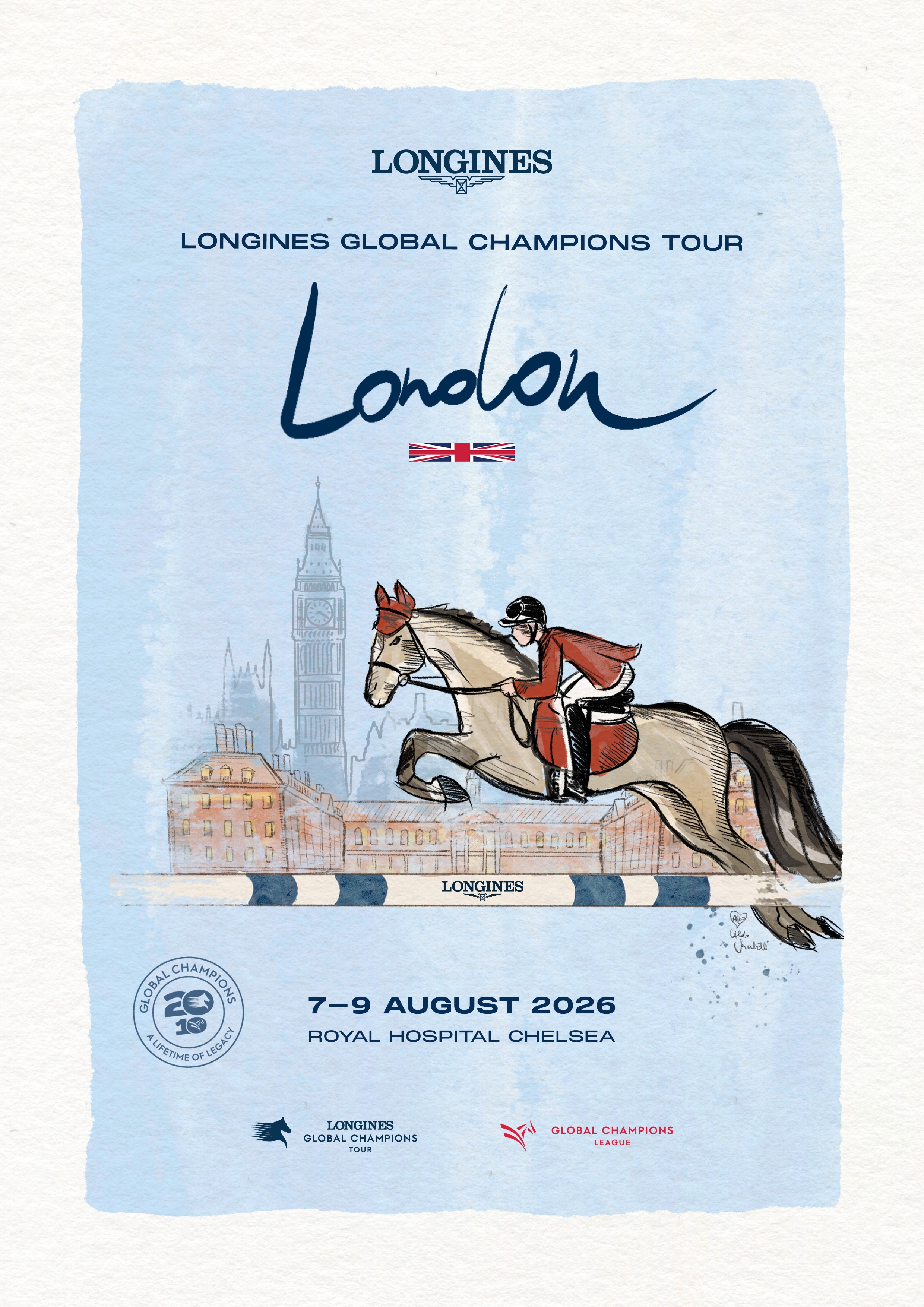Created in collaboration with artist Aldo Sacchetti, the series features a hand-painted artwork for every event on the 2026 calendar. Each poster is illustrated individually, capturing the movement, elegance and atmosphere that define Global Champions at each destination, while forming a cohesive creative language across all 17 stages of the Tour.