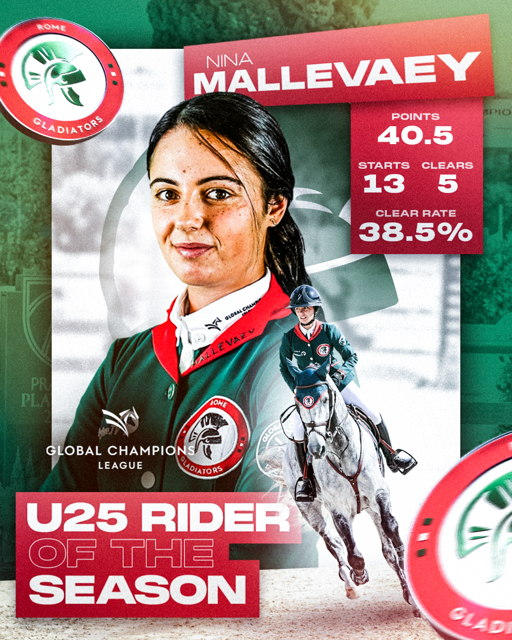 The future of equestrian sports shines bright with talent like Nina Mallevaey. As a key member of the Rome Gladiators powered by ClipMyHorse.TV, Mallevaey demonstrated exceptional skill, earning her the title of GCL U25 of the Year. Her achievements not only showcase her individual success but also her contribution to the promising future of the sport.