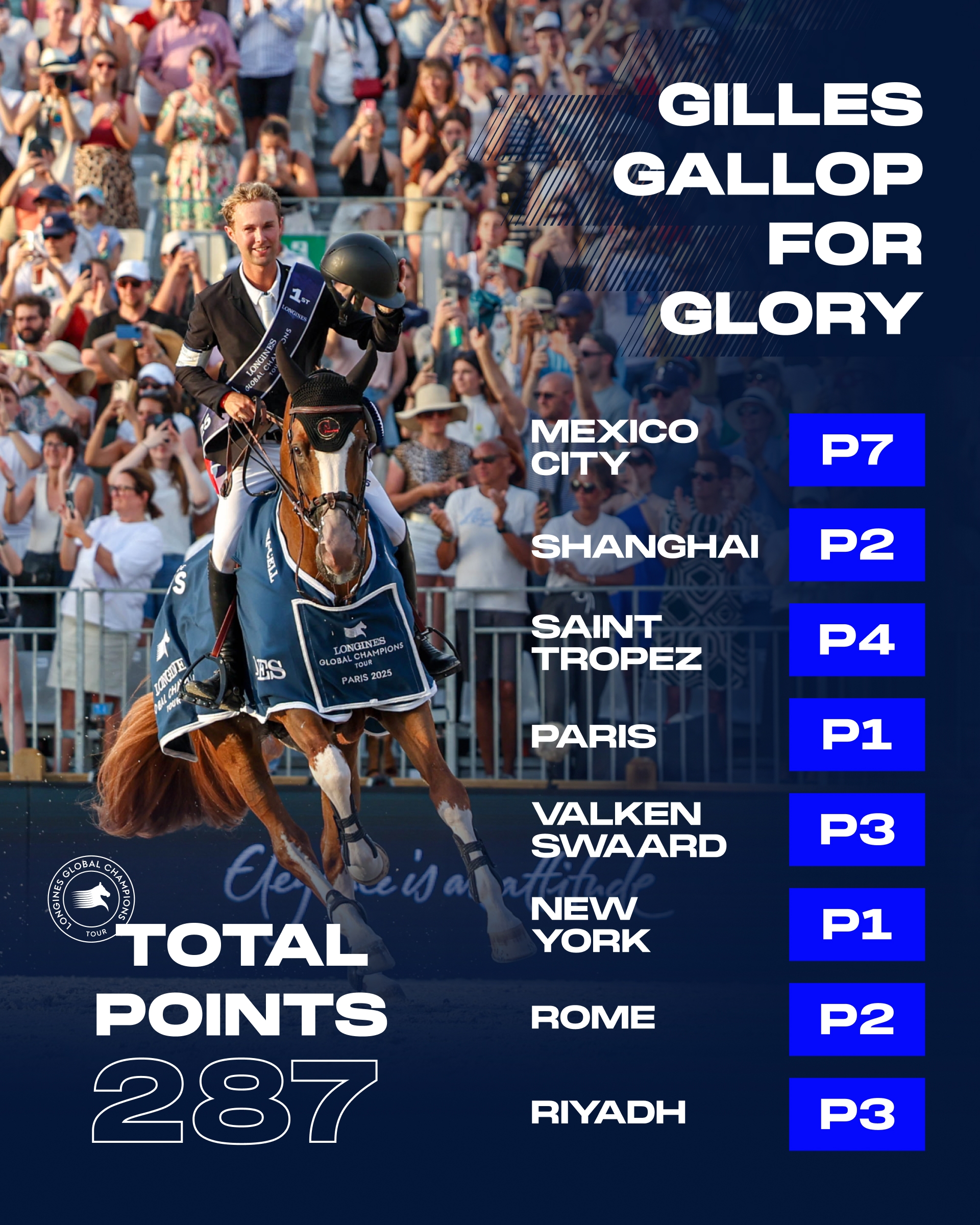 If Gilles sounds like a man who just stepped out of a fast car, there’s a reason. Ask any rider: the LGCT/GCL circuit feels more and more like a horsepower-powered Formula 1 season.